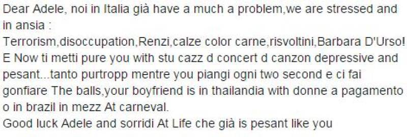 La pagina dell’evento di Adele, che sarà in concerto all’Arena di Verona il 28 e 29 maggio 2016, è stata letteralmente invasa da centinaia e centinaia di commenti e battute ironiche sulla sua musica. Inglese maccheronico, battute sugli ex fidanzati, la tristezza e quant’altro, un fenomeno esploso per caso e che come accade sempre è andato fuori controllo.