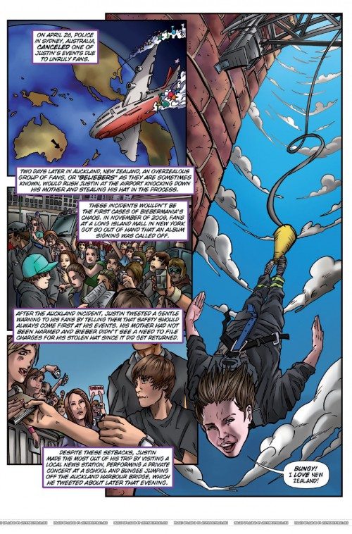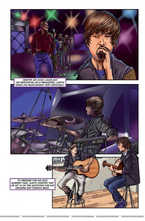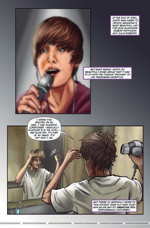 Dopo Lady Gaga, Robert Pattison, Kristen Stewart, Taylor Lautner e Taylor Swift è arrivato anche il turno di Justin Bieber. Il giovane cantante è finito su “Fame“, una collana di fumetti della Bluewater Productions scritta da Tara Broeckel Oote e disegnata da Claudio Avella. Justin Bieber in Fame Il racconto della vita di Justin Bieber attraverso le immagini, a partire dalla sua difficile infanzia, durante la quale ha attraversato anche un momento di povertà. Adessola vita di Justin Bieber va alla grande, il sedicenne ha ottenuto un successo planetario tramite Youtube ed è acclamato da migliaia di fan in tutto il mondo, spesso in maniera anche eccessiva. Ecco qui le immagini di “Fame”, anche se purtroppo il fumetto non arriverà in Italia. Ma date un’occhiata alla gallery, vi piacciono?