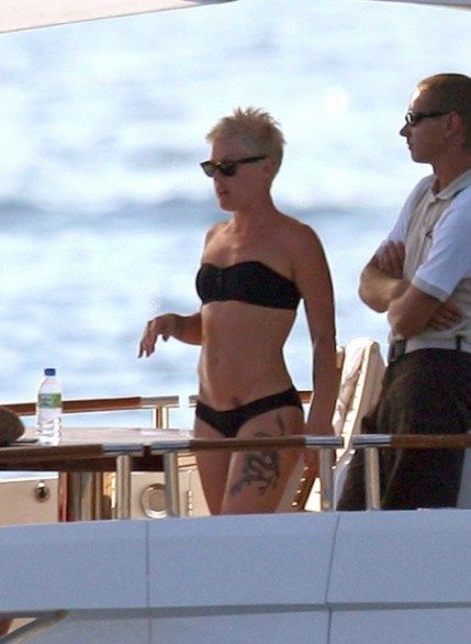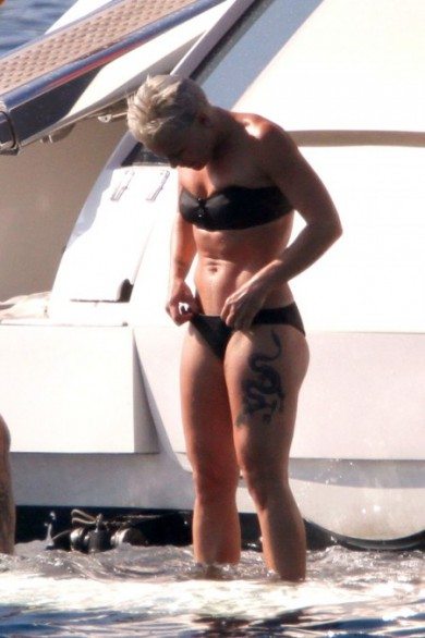 La cantante si gode l’estate su uno yacht nel sud della Francia in compagnia del fidanzato Carey Hart, mostrando un fisico sempre tonico e muscoloso.